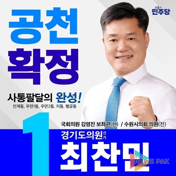 뉴스팍 배상미 기자 | 최찬민 경기도의원 예비후보(김영진 국회의원 보좌관)가 수원시 제6선거구(인계동,우만1동,우만2동,지동,행궁동)에서 6.3지방선거에 출마할 더불어민주당 경기도의원 후보로 확정돼 본선 승리를 위한 본격 행보에 나섰다.