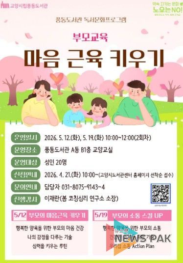 뉴스팍 배상미 기자 | 고양특례시 풍동도서관은 오는 5월 독서문화 프로그램 ‘부모교육, 마음 근육 키우기’를 진행한다고 22일 밝혔다.