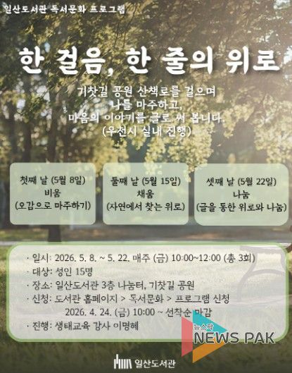 일산도서관 관계자는 “‘한 걸음, 한 줄의 위로’는 자연 속에서 천천히 걷고 글로 자신을 표현하는 과정을 통해 스스로를 돌보고 치유하는 프로그램”이라며, “참여자들이 서로의 이야기를 나누며 공감과 위로를 경험하는 시간이 되길 바란다”고 전했다.