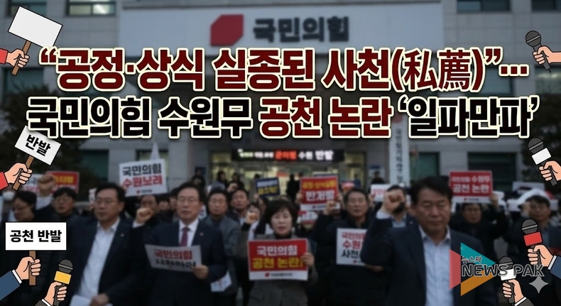 뉴스팍 배상미 기자 | 6.3 지방선거를 앞두고 국민의힘 수원무 지역구 공천 과정이 이른바 ‘사천(私薦)’ 논란에 휩싸이며 지역 정가가 요동치고 있다. 위장전입 의혹부터 전과 이력, 지역 및 정당 활동 전무 인사의 낙하산 공천 의혹까지 제기되면서 당원들의 반발이 조직적 행동으로 번지는 양상이다.