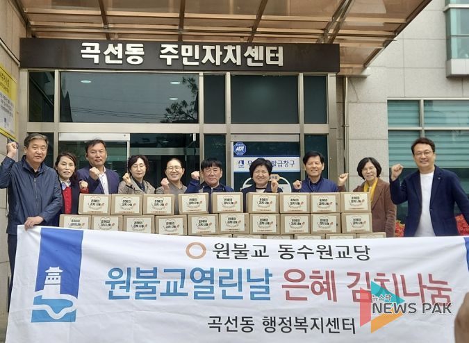 뉴스팍 배상미 기자 | 원불교 동수원교당은 지난 22일 수원시 권선구 곡선동 행정복지센터에서 봄맞이 ‘은혜김치 나눔’ 전달 행사를 개최하고, 정성껏 담근 김치 30박스를 곡선동에 전달했다.