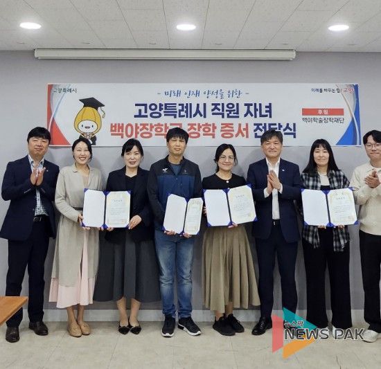 뉴스팍 배상미 기자 | 고양특례시는 지난 22일 ‘백야학술장학재단 장학금 전달식’을 개최해, 고양시 직원의 대학생 자녀 중 학업성적이 우수하고 타의 모범이 되는 인재 4명에게 장학증서와 장학금을 전달했다.