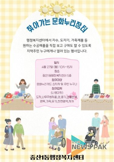 뉴스팍 배상미 기자 | 고양특례시 일산동구 중산1동은 오는 4월 27일 오전 10시부터 오후 3시까지 센터 5층 다목적실에서 ‘찾아가는 문화누리장터’를 개최한다.