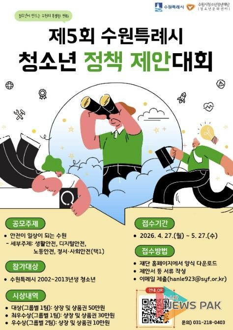 뉴스팍 배상미 기자 | 수원시청소년청년재단 수원청소년문화센터는 청소년이 정책을 기획하고 제안하는 ‘제5회 수원특례시 청소년 정책 제안대회’ 참가팀을 4월 27일부터 5월 27일까지 모집한다.