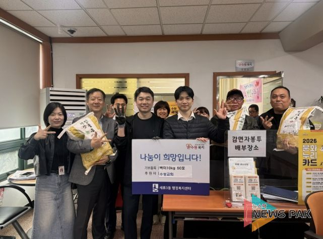 뉴스팍 배상미 기자 | 수원시 권선구 소재 수성교회는 세류3동행정복지센터에 쌀 50포를 기부하며, 지역 내 어려운 이웃을 위한 따뜻한 나눔을 실천했다.