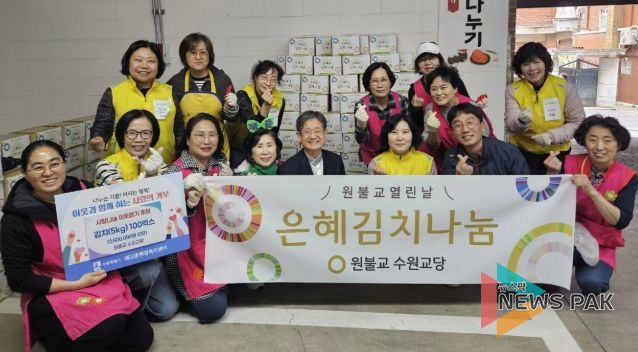 뉴스팍 배상미 기자 | 수원시 팔달구 매교동은 지난 22일, 원불교 수원교당(교구장 김도천)으로부터 직접 담근 배추김치(5kg) 100박스를 기부받았다고 밝혔다.