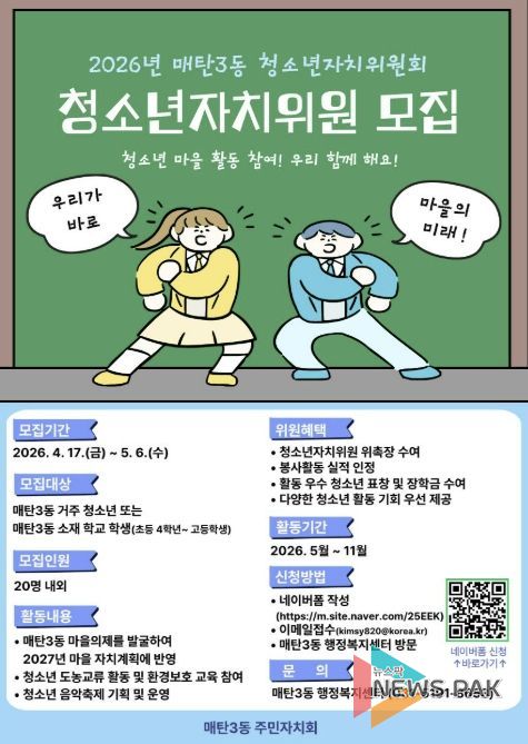 뉴스팍 배상미 기자 | 수원시 영통구 매탄3동은 매탄3동 주민자치회가 지역 청소년의 참여를 확대하고, 향후 지역사회를 이끌어 나갈 역량을 기르기 위해 2026년 청소년자치위원회 위원을 모집한다고 밝혔다.