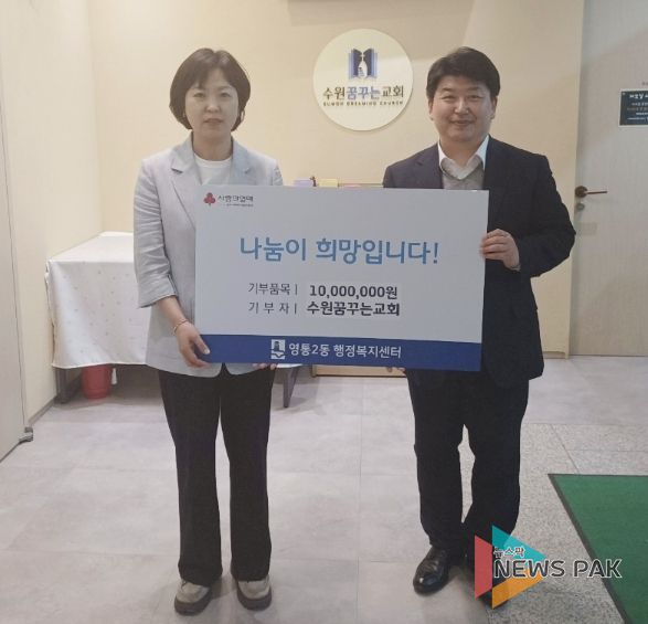 뉴스팍 배상미 기자 | 수원시 영통구 영통2동은 지난 23일 수원꿈꾸는교회가 지역사회 내 취약계층 지원을 위해 교인들과 함께 모금한 사랑의 성금 1천만원을 영통2동 행정복지센터에 기부했다고 밝혔다.