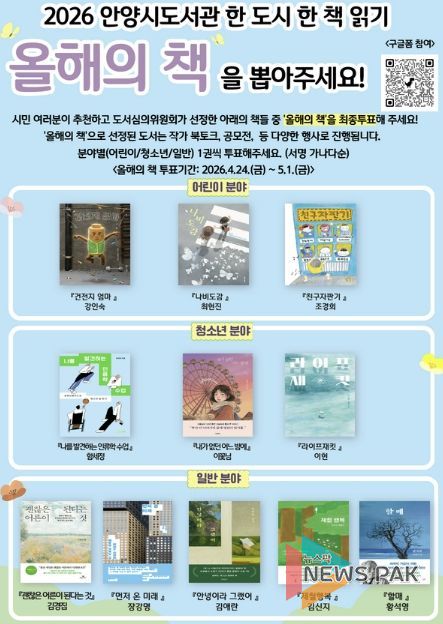 뉴스팍 배상미 기자 | 안양시는 2026년 한 도시 한 책 읽기 ‘올해의 책’ 선정을 위한 시민 선호도 조사를 오는 5월 1일까지 온·오프라인으로 진행한다고 24일 밝혔다.