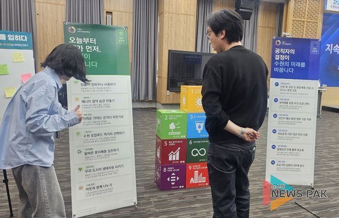뉴스팍 배상미 기자 | 수원특례시는 24일 시청 중회의실에서 지속가능발전목표(SDGs) 추진사업 실무자를 대상으로 ‘내 업무에 지속가능발전목표 입히기’ 캠페인을 진행했다.