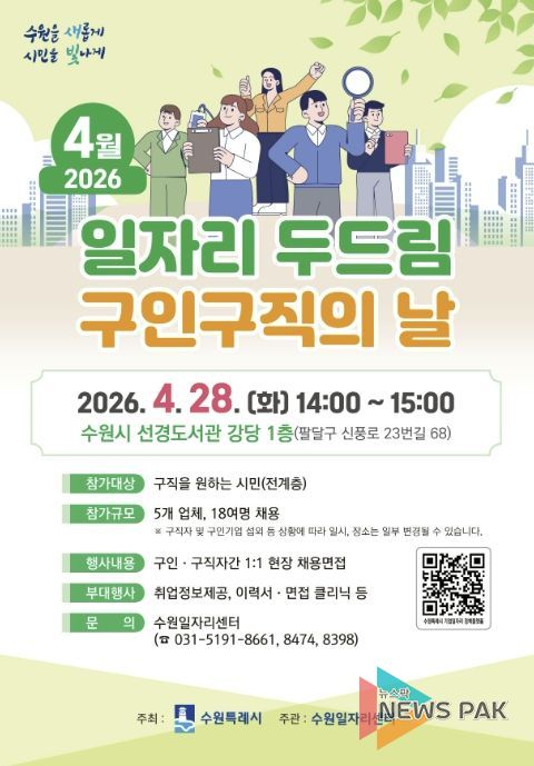 뉴스팍 배상미 기자 | 수원특례시는 4월 28일 오후 2시부터 3시까지 선경도서관 강당에서 ‘4월 일자리 두드림 구인·구직의 날’을 개최한다.