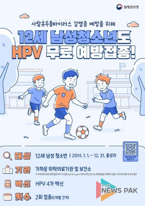 뉴스팍 배상미 기자 | 안성시는 사람유두종바이러스(HPV) 감염 질환을 예방하고 접종 형평성을 높이기 위해, 오는 5월 6일부터 HPV 국가예방접종 지원 대상을 12세(2014년생) 남성 청소년까지 확대한다고 밝혔다.