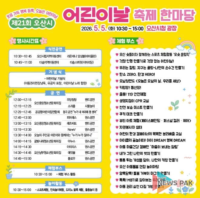 뉴스팍 이소율 기자 | 오산시는 오는 5월 5일 어린이날을 맞아 오산시청 광장에서 ‘제21회 오산시 어린이날 축제 한마당’을 개최한다고 밝혔다.
