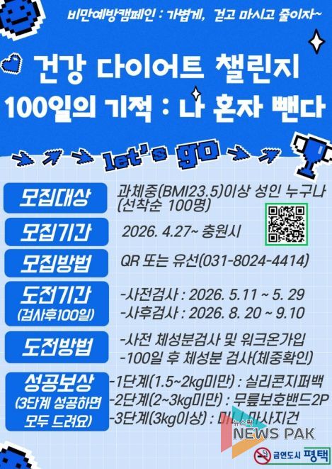 뉴스팍 이소율 기자 | 평택시는 시민들이 스스로 비만 관리 능력을 키우고 건강한 생활 습관을 정착시킬 수 있도록 돕는 비만 예방 프로그램 '100일의 기적’참가자를 모집한다고 밝혔다.