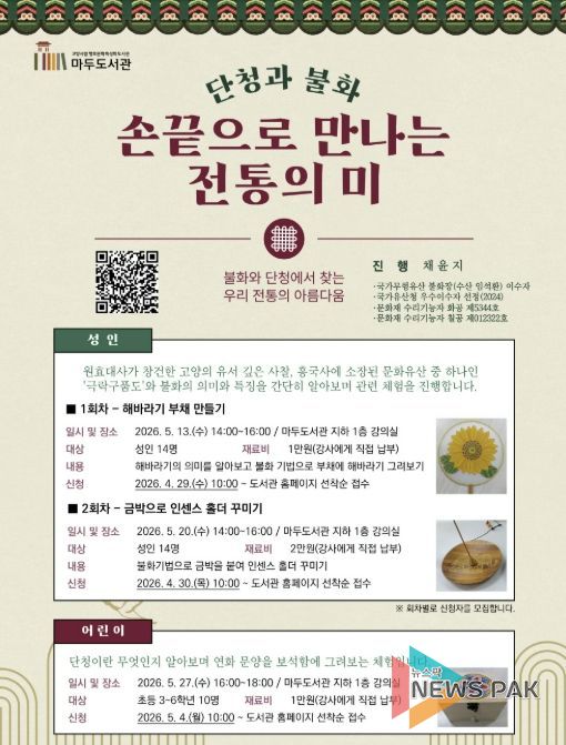 뉴스팍 배상미 기자 | 고양특례시 마두도서관은 오는 5월, 단청과 불화를 주제로 우리 전통의 아름다움을 체험할 수 있는 프로그램 ‘손끝으로 만나는 전통의 미’를 운영한다.