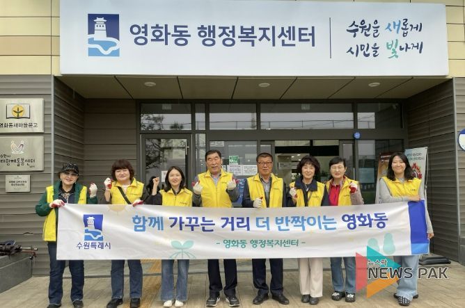 뉴스팍 배상미 기자 | 수원시 장안구 영화동은 지난 28일, 주민자치회와 함께 거북시장 사거리 일대에서 봄철 환경정비 활동을 실시하며 쾌적한 마을환경 조성에 나섰다.