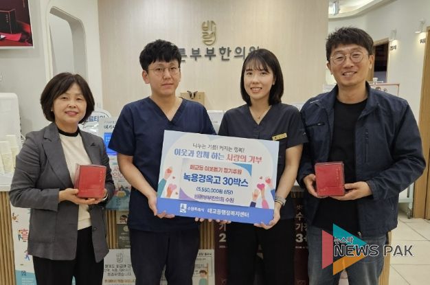 뉴스팍 배상미 기자 | 수원시 팔달구 매교동는 지난 27일, 바른부부한의원 수원으로부터 5,550천원 상당 녹용경옥고(30개입) 30박스를 기부받았다고 밝혔다.