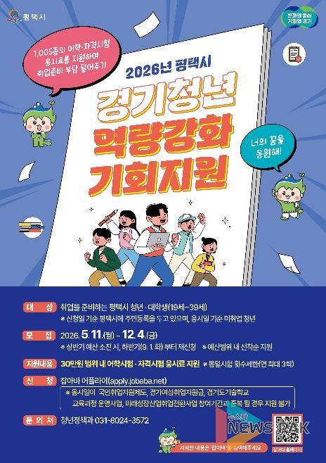 뉴스팍 이소율 기자 | 평택시는 미취업 청년들의 취업 준비 부담을 덜어주고 취업에 필요한 자격 기준을 갖출 수 있는 기회를 마련하여 지속적인 취업 도전 의지를 제고해주는 '경기청년 역량강화 기회지원'사업을 추진한다.