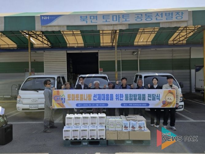 뉴스팍 배상미 기자 | 가평군은 최근 북면 토마토 공동선별장에서 토마토 뿔나방 예방을 위한 통합방제물품 전달식을 가졌다.