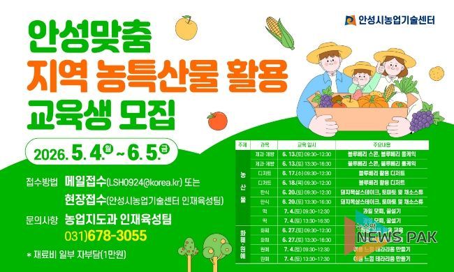 뉴스팍 배상미 기자 | 안성시농업기술센터는 지역 농산물을 활용한 실습 교육을 통해 소비를 촉진하고 ‘지산지소(지역에서 생산된 농산물을 지역에서 소비함)’ 문화를 활성화하고자, 오는 5월 4일부터 6월 5일까지 교육생을 모집한다고 밝혔다.