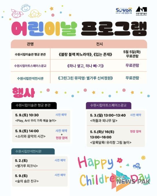 뉴스팍 배상미 기자 | 경기도 수원시립미술관은 2026년 어린이날을 맞아 수원시립미술관 행궁 본관, 수원시립아트스페이스광교, 수원시립만석전시관에서 즐거운 하루를 보낼 수 있는 전시와 다양한 프로그램을 운영한다.