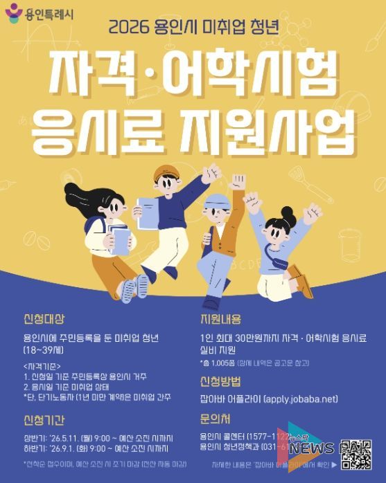 뉴스팍 배상미 기자 | 용인특례시는 취업을 위해 어학과 자격증 시험 등을 준비 중인 청년을 위해 응시료 30만 원을 지원한다고 30일 밝혔다.