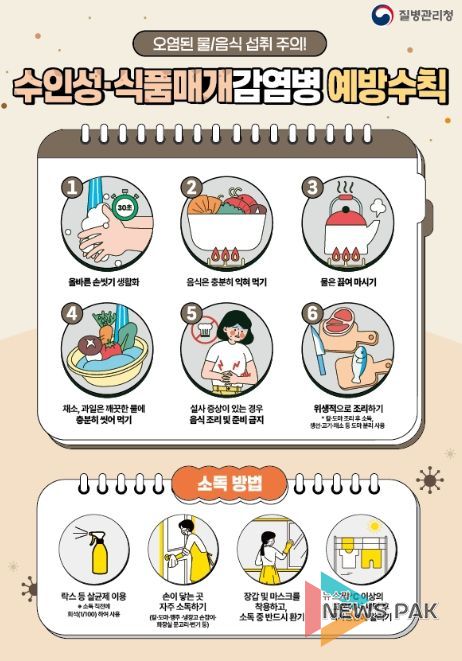 수인성ㆍ식품매개감염병은 병원성 세균, 바이러스, 원충에 오염된 물이나 식품을 섭취해 구토, 설사, 복통 등의 장관 증상을 유발한다. 이를 예방하기 위해서는 ▲올바른 손 씻기 생활화 ▲음식 충분히 익혀 먹기 ▲물 끓여 마시기 ▲채소ㆍ과일 깨끗한 물에 충분히 씻어 먹기 ▲설사 증상 시 음식 조리 및 준비 금지 ▲위생적으로 조리하기 등 예방수칙을 준수해야 한다.