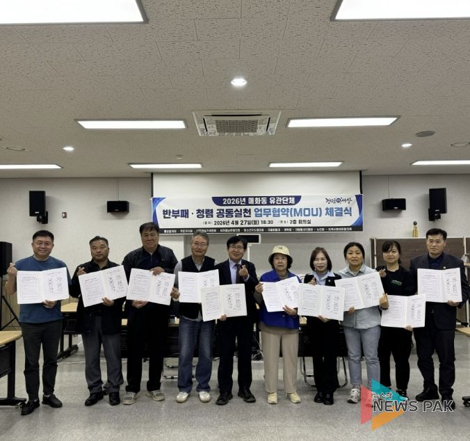 뉴스팍 배상미 기자 | 시흥시 매화동 행정복지센터는 지난 4월 27일 청렴 가치 실천과 청렴 문화 확산을 위해 관계단체와 함께 ‘반부패·청렴 공동실천 업무협약’을 체결했다.