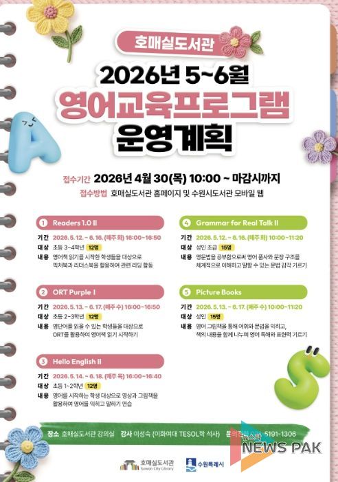 뉴스팍 배상미 기자 | 수원시 호매실도서관이 5~6월 영어교육 프로그램 참가자를 모집한다. 이성숙 강사(이화여대 TESOL학 석사)가 강의한다.