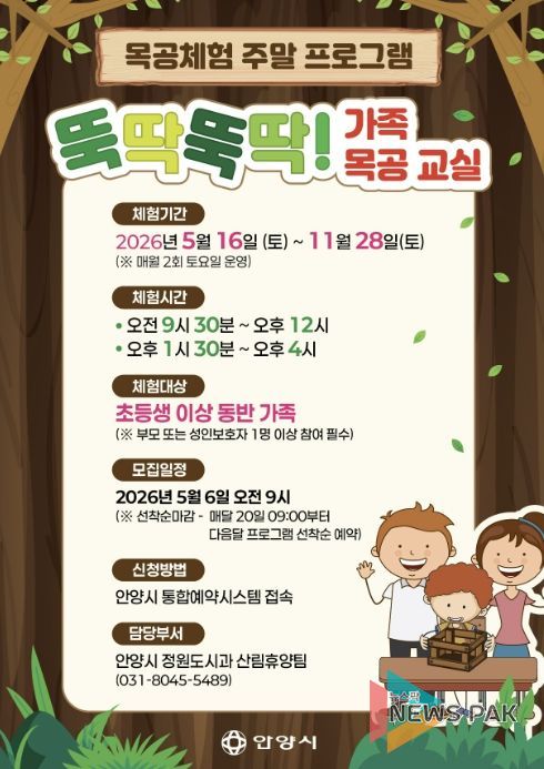 뉴스팍 배상미 기자 | 안양시는 초등학생과 가족이 함께 참여할 수 있는 목공체험 주말 프로그램인 ‘뚝딱뚝딱! 가족 목공 교실’을 운영한다고 30일 밝혔다.