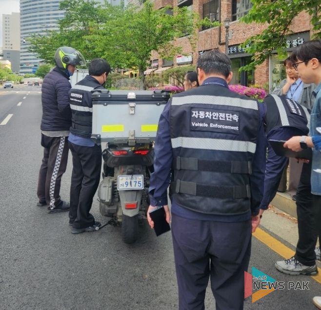 뉴스팍 배상미 기자 | 수원시 영통구는 지난 4월 29일 이의동 연무중사거리 일대에서 수원영통경찰서, 한국교통안전공단과 합동으로 법규위반 이륜자동차를 단속했다고 밝혔다.