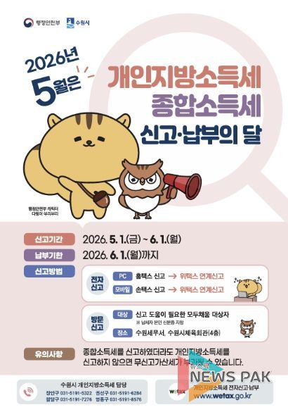 뉴스팍 배상미 기자 | 수원시 장안구는 2026년 개인지방소득세 신고·납부의 달을 맞아, 지난해 12월 31일 기준으로 장안구 내 주소지를 둔 개인은 5월 1일부터 6월 1일까지 개인지방소득세를 신고·납부해야 한다고 밝혔다.