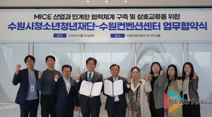 뉴스팍 배상미 기자 | 수원시청소년청년재단(이사장 최종진)과 수원컨벤션센터가 4월 30일 양 기관의 상호 협력과 교류 확대를 위한 업무협약을 체결했다.