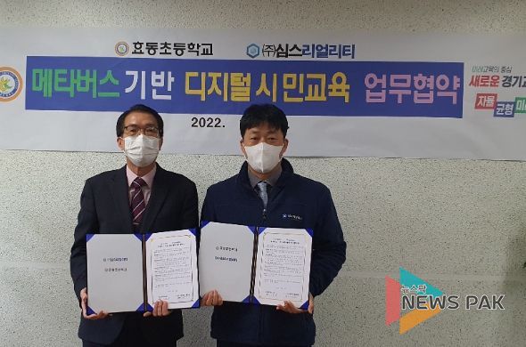 뉴스팍 이지율 기자 | 효동초등학교는 30일 에듀테크 기업‘심스리얼리티’와 메타버스 기반 디지털 시민교육 업무협약을 체결했다.