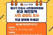 뉴스팍 배상미 기자 | 안성시는 오는 18일 오후 6시까지 시민참여위원회 분과별 제안 정책에 대한 시민 의견을 수렴한다고 밝혔다. 이번 시민 의견 수렴은 시민참여위원회 정책 발표회를 앞두고 진행하는 사전심사로, 분과별 제안 정책에 대한 시민 공감도를 확인하여 추후 현장심사 결과와 함께 최종 우수 제안 정책을 선정하는 데 활용된다. 7개 분과로 구성된 안성시 시민참여위원회는 소속 위원의 다양한 경험과 지속적인 논의를 바탕으로 안성시 시정에 반영할 정책 연구 활동을 추진해 왔으며, 이달 정책 발표회를 통해 각 분과에서 도출한 정책을 제안하여 그간 활동의 결실을 맺을 예정이다. 정책 발표회를 통해 각 분과에서 제안할 정책 주제는 ▲Safety 안성, 시민이 안전한 도시 만들기(공공혁신분과) ▲안성시 평생학습도시에 따른 평생교육 강사 플랫폼 구축(교육특화분과) ▲안성시 한우산업 탄소중립 모니터링 시스템 구축(미래농업분과) ▲안성시민을 위한 태양광발전 5개년 계획(생태도시분과) ▲전통문화 예술인들을 위한 창작공간 확보(문화도시분과) ▲안성, 사랑 흔들바위 관광지 조성(문화도시분과) ▲더불어 이동하는 자유로운 안성(생활