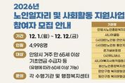 뉴스팍 배상미 기자 | 안양시가 1일부터 12일까지 건강하고 활기찬 노후를 위한 ‘2026년 노인일자리 및 사회활동 지원사업’의 참여자 4,998명을 모집한다. 참여자 규모는 유형별로 ▲노인공익활동 3,155명 ▲노인역량활용 1,106명 ▲공동체사업단 574명 ▲취업지원 163명 등이다. 노인일자리사업의 수행기관은 ▲안양시노인종합복지관 ▲비산노인종합복지관 ▲안양시니어클럽 ▲만안·동안노인지회 ▲경기실버포럼 ▲(사)위니버스 ▲시니어복지사회적협동조합 ▲만안구청 ▲동안구청 등 10곳이며, 참여자는 수행기관에서 추진하는 다양한 일자리·사회활동에 참여하게 된다. 신청 자격은 공고일(11월 27일) 기준 안양시에 주민등록이 되어 있는 어르신이다. 세부 기준은 ▲노인공익활동은 65세 이상 기초연금·직역연금 수급자(배우자 포함) ▲노인역량활용은 65세 이상(일부 유형은 60세 이상) ▲공동체사업·취업지원은 60세 이상이다. 다만, 생계급여 수급자(취업지원 제외), 건강보험 직장가입자, 장기요양등급자 등 일부 대상자는 신청이 제한된다. 희망자는 신분증과 주민등록등본 등을 지참하고 해당 수행기관 또는 거