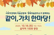 뉴스팍 배상미 기자 | 가평군은 오는 18일 오전 10시부터 오후 3시까지 음악역 1939 광장에서 주민과 함께하는 축제 ‘2025년 같이, 가치 한마당’을 연다. 이번 행사는 사회적경제기업의 판로 확대와 마을공동체, 경기행복마을관리소의 활동 성과를 알리고 주민 참여를 확대하기 위해 마련됐다. 행사에는 사회적경제기업 5곳, 마을공동체 16곳, 경기행복마을관리소 4곳 등 총 25개 단체가 참여한다. 이날 주민들은 현장에서 직접 사회적경제기업의 제품을 구매할 수 있으며, 공동체별 특색 있는 프로그램을 즐길 수 있다. 주요 프로그램은 △사회적경제기업 생산품 홍보·판매 △공동체와 경기행복마을관리소 활동 전시 및 무료 체험 △합창·뮤지컬 갈라쇼·힐링체조 등 공연 △경품 이벤트 등이 마련돼 있다. 특히 가평마을교육공동체가 제작한 단편영화 상영 등 주민 주도 콘텐츠도 선보일 예정이다. 가평군 관계자는 “‘같이, 가치 한마당’ 축제를 통해 지역사회에서 사회적경제와 공동체 활동이 더욱 확산되기를 기대한다”며 “이번 행사가 지역경제의 활력으로 이어질 수 있도록 주민 여러분의 많은 방문과 성원을 부탁드린다”고 말했다