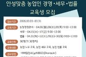 뉴스팍 배상미 기자 | 안성시농업기술센터가 지역 농업인의 안정적인 영농 활동을 돕기 위해 오는 31일까지 ‘안성맞춤 농업인 경영·세무·법률 교육’ 교육생을 모집한다. 이번 교육은 전문가 특강을 통해 농가 운영 중 발생할 수 있는 경영적, 법적 문제를 사전에 예방하고 해결할 수 있는 역량을 키워주기 위해 마련됐다. 교육은 오는 4월 6일부터 30일까지 주제별 지정된 날짜에 진행된다. 모집 분야는 ▲농업 경영 ▲농업 세무 ▲농업 법률 등 3개 과정이며, 분야별로 30명씩 총 90명을 선발한다. 신청 인원이 초과할 경우 내부 선발 기준에 따라 교육생을 최종 선정할 예정이다. 신청 자격은 농업 경영에 관심 있는 안성시민이라면 누구나 가능하며, 접수는 3월 31일까지다. 참여를 희망하는 시민은 이메일을 보내거나 농업기술센터 농업지도과(보개원삼로 219)를 방문해 신청하면 된다. 시 관계자는 “농업인의 눈높이에 맞춘 경영·법률·세무 전문가 특강이 농가 역량을 강화하는 좋은 기회가 될 것”이라며, “안성 농업의 내실을 다지고 싶은 시민 여러분의 많은 관심과 참여를 바란다”고 말했다.