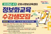뉴스팍 배상미 기자 | 군포시는 시민들의 정보화 시대에 대한 적응 능력 향상 및 정보 소외 계층의 디지털 격차 해소를 위해 운영되는 ‘2025년 4기 시민정보화교육’의 수강생을 오는 10월 15일부터 10월 19일까지 모집한다고 13일 밝혔다. 이번 교육은 컴퓨터와 스마트기기 기초 사용법부터 최신 인공지능(AI) 활용 기술까지 다양한 주제로 구성되며, 군포시민을 대상으로 총 10개 강좌가 운영된다. 수강료는 무료이나, 강좌에 따라 교재를 개별 구매해야 할 수도 있다. 수강신청은 2025년 10월 15일 오전 10시부터 10월 19일 오후 6시까지 가능하며, 군포시청 홈페이지 또는 군포시 정보교육센터(산본로324번길 8, 504호, 주말 휴무) 방문을 통해 신청할 수 있다. 이번 교육에서는 컴퓨터나 스마트폰에 익숙하지 않은 초보자를 대상으로 하는 ▲컴퓨터 기초 ▲스마트폰 기초 및 활용 ▲실용인터넷 강좌 뿐만 아니라 실생활과 업무에 유용한 ▲속성 한글 ▲엑셀 기초 ▲스마트폰 중급 강의도 포함되어 있다. 또한 최신 기술을 반영한 ▲동영상 제작 ▲3D 프린팅 ▲ChatGPT · 생성형AI ▲AI활용 유튜브 콘텐츠 제