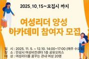 뉴스팍 배상미 기자 | 안성시는 지역사회 발전을 이끌 열정있고 능력있는 여성 지도자를 발굴·육성하기 위해 ‘2025년 안성시 여성리더 양성 아카데미’ 기본과정 교육 참가자를 모집한다. 이번 아카데미는 적극적으로 참여할 수 있는 여성 시민 누구나 신청할 수 있으며, 신청기간은 오는 10월 15일부터 시작된다. 교육은 11월 5일부터 12월 10일까지 6주간 매주 수요일에 안성시여성비전센터 (발화대길 25) 1층 공유오피스에서 진행 될 계획이다. 교육 내용은 ‘나는 당신이 행복했으면 좋겠습니다.’ 라는 주제로 김경희 강사의 행복소통 리더십 강의로 개강식을 열고 2~3주차는 감성을 담아 나를 알리는 SNS 활용법 이론편과 실습편, 4~5주차에는 나만의 비서 만들기 챗봇과 생성형 AI교육 이론편과 실습편을 구성하여 최신 트렌드에 맞춘 리더 역량 강화를 위한 강의들로 구성했으며 6주차에는 퍼실리테이션 기법을 활용하여 지역 내 현안 문제를 파악하고 리더로서 해결 방법을 제시하는 과정을 마지막으로 수료식을 가질 예정이다.