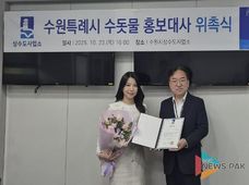 뉴스팍 배상미 기자 | 수원특례시는 리포터 이단비를 ‘수돗물 홍보대사’로 위촉했다. 위촉식은 23일 수원시 상수도사업소 소장실에서 열렸다. 이단비 리포터는 20년 베테랑 방송인으로서 친근하고 신뢰감 있는 이미지로 시민에게 잘 알려져 있다. 다양한 방송 활동을 하고 있다. 앞으로 수원의 깨끗하고 안전한 수돗물을 널리 알리는 홍보활동을 펼칠 예정이다. 수원시는 수돗물 홍보대사 위촉을 계기로 시민과 소통을 강화하고, 수돗물의 신뢰성과 투명성을 높이는 다양한 캠페인을 이어갈 계획이다. 수원시 관계자는 “이단비 홍보대사님은 친근한 이미지로 잘 알려져 있다”며 “깨끗하고 안전한 수돗물의 가치를 널리 알리는 데 큰 도움이 될 것”이라고 기대했다.